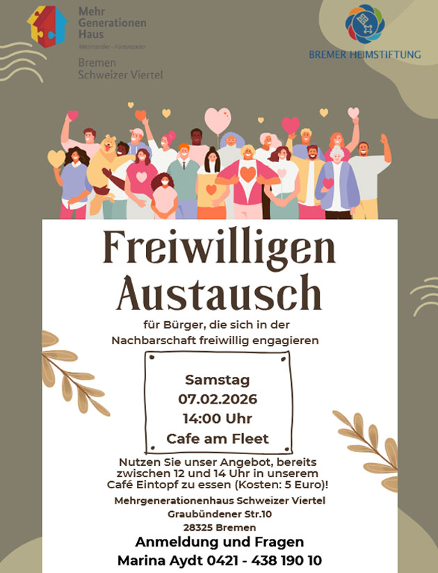 Wo: Café am Fleet, des Mehrgenerationenhaus Schweizer Viertel, Graubündener Str. 10, 28325 Bremen