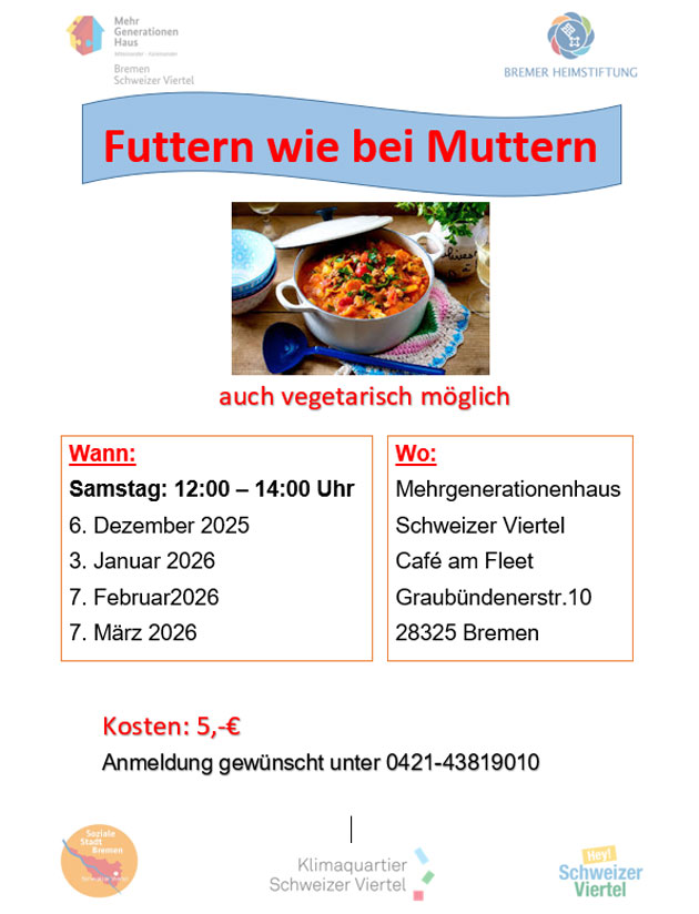 Wo: Café am Fleet des Mehrgenerationenhaus Schweizer Viertel, Graubündener Str. 10, 28325 Bremen
